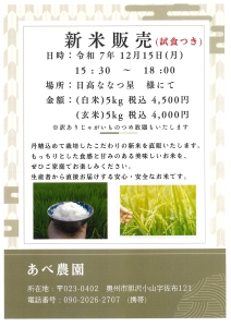 12/15(月) 午後3時からお米の販売会があります 奥州市胆沢のあべ農園産が、日高ななつ星でお米と訳ありジャガイモの詰め放題の販売会を実施いたします。 ぜひ、お買い求めください! 12月15日(月) 午後3時から6時まで 日高ななつ星 3歳以上児園舎前にて こども園 地域について 2025/12/09 nanatsuboshi ≪ 奥州こども食堂ネットワークのご案内 | 12/20(土) 日高こども食堂にじ お弁当販売会のお知らせ ≫ /blog /blog/blog/blog_comments/captcha/93887737 /blog/blog/blog_comments/get_token